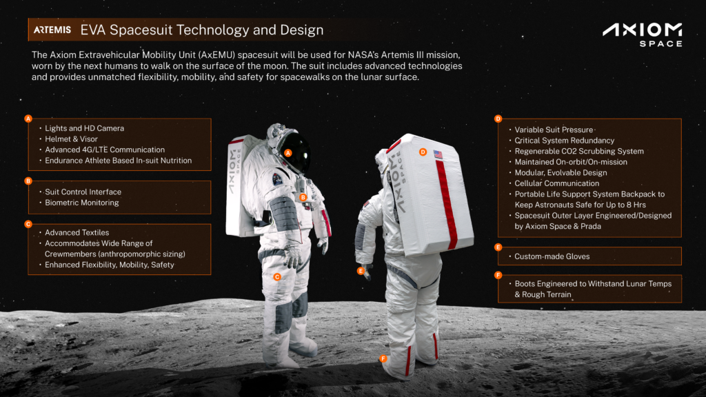 Το μοντέλο που τελειοποιήθηκε από την Prada και την Axiom είναι unisex και μπορεί να προσαρμοστεί σε διάφορα μεγέθη, καθώς με την Artemis 3 θα μεταβεί στη Σελήνη και η πρώτη γυναίκα.
