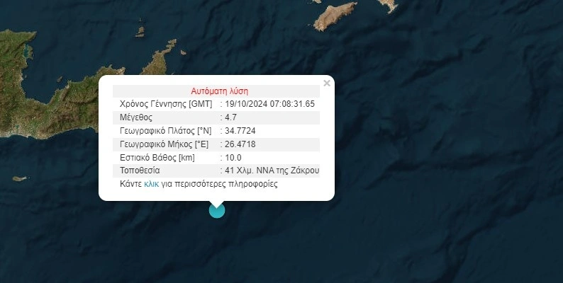 Σεισμός μεγέθους 4,7 βαθμών της κλίμας Ρίχτερ σημειώθηκε, λίγα λεπτά μετά τις 10 το πρωί του Σαββάτου (19/10), στη θαλάσσια περιοχής της Ζάκρου στην Κρήτη.