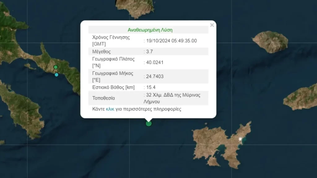 Σεισμός, μεγέθους 3,7 Ρίχτερ βαθμών της κλίμακας Ρίχτερ, σημειώθηκε το πρωί του Σαββάτου ανοικτά της Λήμνου.