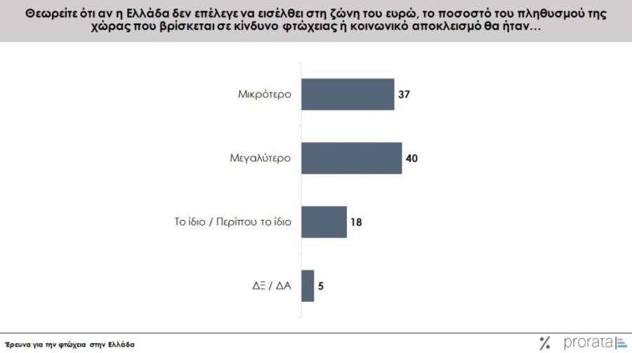 Παράλληλα, όσον αφορά την Ευρωζώνη οι Έλληνες φάνηκαν διχασμένοι, αφού σύμφωνα με την έρευνα οι 4 στους 10 θεωρούν ότι εκτός Ευρωζώνης περισσότεροι πολίτες θα ήταν αντιμέτωποι με τη φτώχεια, ωστόσο, περίπου το ίδιο ποσοστό (37%) πιστεύουν ότι η κατάσταση θα ήταν καλύτερη. Την ίδια στιγμή, ένα σημαντικό 18% εκτιμά ότι η κατάσταση θα ήταν περίπου ίδια.
