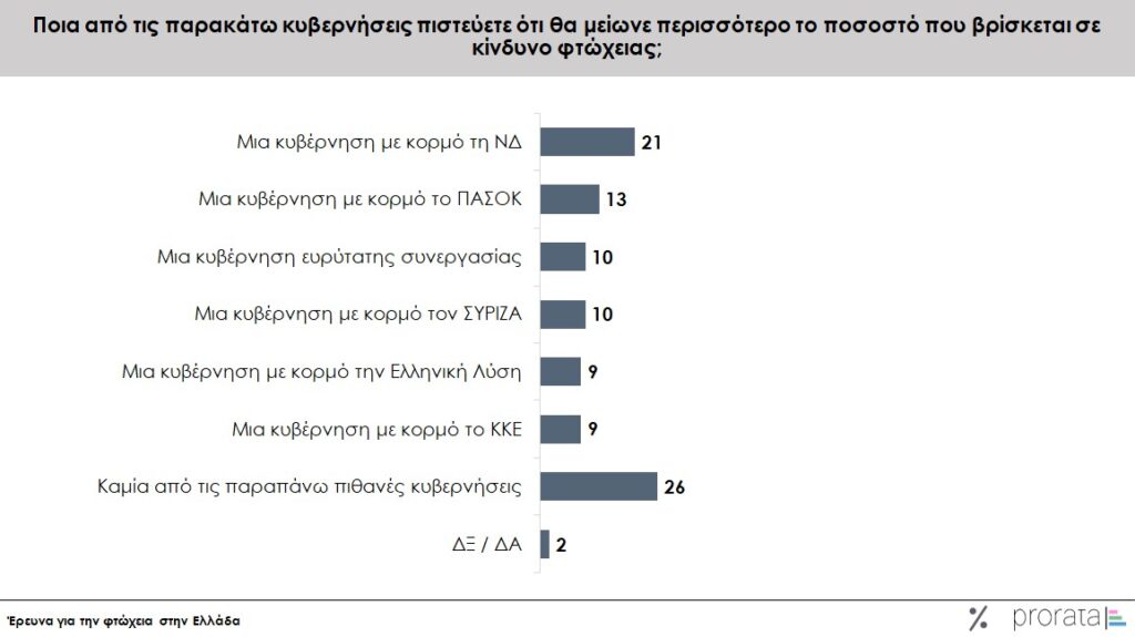 Τέλος, ο 1 στους 5 ερωτηθέντες θεωρεί ότι μια κυβέρνηση με κορμό τη ΝΔ (21%) θα μπορούσε να μειώσει τη φτώχεια, ενώ έρχεται δεύτερο το ΠΑΣΟΚ (13%) και τρίτη μια κυβέρνηση ευρύτατης συνεργασίας (10%). Ωστόσο η πλειοψηφία (26%) δεν θεωρεί ικανή καμία πιθανή κυβέρνηση με κορμό τα κόμματα που παρουσιάστηκαν (ΝΔ, ΠΑΣΟΚ, ΣΥΡΙΖΑ, Ελληνική Λύση και ΚΚΕ) ότι μπορεί να μειώσει τη φτώχεια.