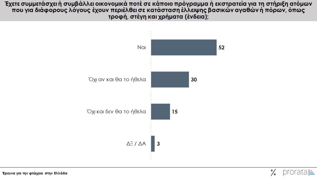 Ένα 52% έχει προσφέρει βοήθεια σε κάποιο πρόγραμμα για τη στήριξη ατόμων σε ανάγκη, ενώ ένα 30% απαντάει πως δεν το έχει κάνει, αν και θα το ήθελε. Επίσης, πάνω από τους μισούς Έλληνες έχουν προσφέρει σε πρόγραμμα ή εκστρατεία για στήριξη ατόμων.