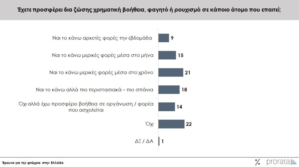 Σύμφωνα με την έρευνα, το 45% των ερωτηθέντων έχει προσφέρει χρήματα, φαγητό ή ρουχισμό σε άτομο που επαιτεί, με μικρότερη ή μεγαλύτερη συχνότητα. Ένα 14% βοηθάει με εναλλακτικούς τρόπους, προσφέροντας βοήθεια σε φορείς. Ωστόσο, υπάρχει και ένα 22% που δεν έχει προσφέρει τον οβολόν του ποτέ.