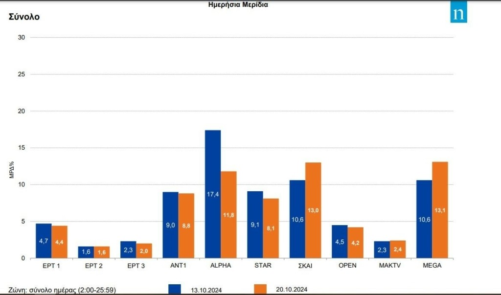 Κρατήθηκε στα διψήφια το μερίδιο του ANT1, το οποίο ήταν σχεδόν ολόιδιο με εκείνο που είχε το προπερασμένο Σάββατο. Αντιθέτως η επίδοση του Mega πέρασε στα μονοψήφια νούμερα. Ίδια πάνω κάτω ήταν η δυναμική του Star, με εκείνη που είχε αναπτύξει μια βδομάδα πίσω, ενώ ΕΡΤ1 και Open μοιράστηκαν την πέμπτη θέση στις προτιμήσεις του κοινού.