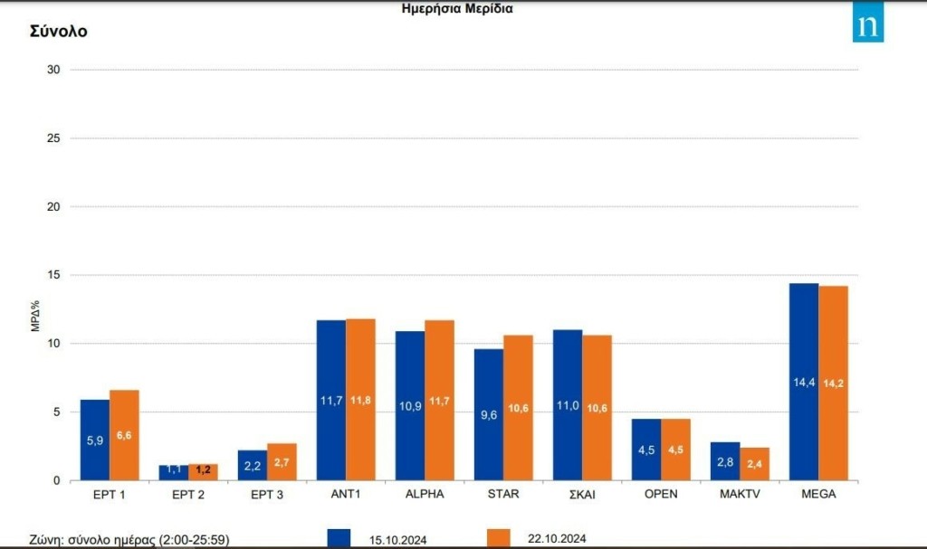 Ξεμάκρυνε χθες Τρίτη (23/10) από τον ανταγωνισμό το Mega αυξάνοντας το μέγεθος του μεριδίου του συγκριτικά με αυτό της Δευτέρας. Με εξαίρεση την ΕΡΤ1 που είδε και το δικό της μερίδιο να μεταβάλλεται κατά 0,4% επικράτησαν σταθεροποιητικές τάσεις στις επιδόσεις των άλλων καναλιών.