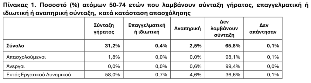 Όσον αφορά στην προσπάθεια για κατοχύρωση συνταξιοδοτικού δικαιώματος σε σχέση με την κατάσταση απασχόλησης και τη λήψη σύνταξης, για το σύνολο των ατόμων ηλικίας 50 έως 74 ετών, παρατηρείται ότι το 31,6% παίρνει σύνταξη, εκ των οποίων όμως ποσοστό 0,8% εξακολουθεί να εργάζεται, και ένα σημαντικό ποσοστό της τάξης του 42,4% δεν παίρνει σύνταξη και εξακολουθεί να εργάζεται προσπαθώντας να κατοχυρώσει συνταξιοδοτικό δικαίωμα.