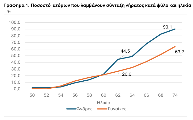 Όπως διευκρινίζει η ΕΛΣΤΑΤ, το ποσοστό των ατόμων ηλικίας 50-74 ετών που λαμβάνουν σύνταξη γήρατος διαφοροποιείται σημαντικά ανάλογα με το φύλο και την ηλικία. Μέχρι την ηλικία των 54 ετών το ποσοστό που λαμβάνει σύνταξη είναι πολύ χαμηλό, κάτω του 5,0%, και αυξάνεται με παρόμοιο τρόπο και για τα δύο φύλα μέχρι την ηλικία των 60 ετών. Μετά τα 60 έτη, το ποσοστό των ατόμων που λαμβάνουν σύνταξη είναι σημαντικά μεγαλύτερο για τους άνδρες έναντι των γυναικών, και στην ηλικία των 74 ετών ανέρχεται στο 90,1% για τους άνδρες και στο 63,7% για τις γυναίκες.