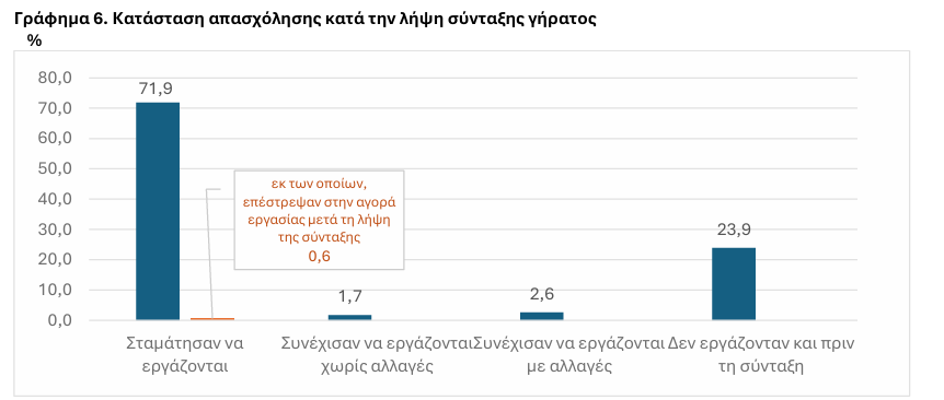 Μικρά ποσοστά καταγράφονται για τα άτομα που είτε συνέχισαν να εργάζονται χωρίς ή με αλλαγές είτε επέστρεψαν στην αγορά εργασίας κάποια στιγμή αργότερα (1,7%, 2,6% και 0,6%, αντίστοιχα). Ως βασικότερος λόγος που τα άτομα ηλικίας 50 έως 74 ετών, τα οποία λαμβάνουν σύνταξη γήρατος και σταμάτησαν να εργάζονται, δηλώνεται η προτίμηση να σταματήσουν να εργάζονται από τη στιγμή που κατοχυρώθηκε το δικαίωμα σύνταξης (77,3%), ενώ ένα σημαντικό ποσοστό 15% δηλώνει ότι υποχρεώθηκε να σταματήσει λόγω ορίου ηλικίας.