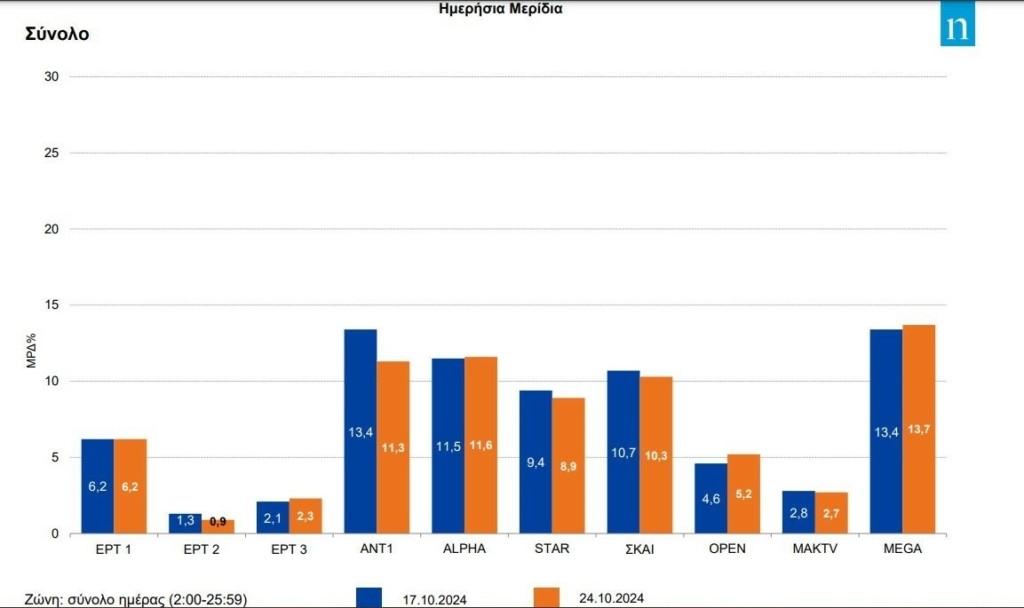 Πτωτική ήταν η τάση του γενικού δείκτη της Nielsen (μόλις 4 στα 10 κανάλια είχαν θετικό πρόσημο στα μερίδια τους) την Πέμπτη, αλλά το Mega διατηρήθηκε επικεφαλής στην κούρσα τηλεθέασης παρόλο που οι απώλειές του άγγιξαν το 1% συγκριτικά με το μερίδιο που αποκόμισε την Τετάρτη.