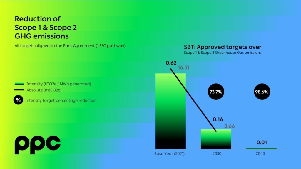 Το SBTi έκρινε ότι οι στόχοι μείωσης των εκπομπών αερίων του θερμοκηπίου που κατέθεσε ο Όμιλος ΔΕΗ βρίσκονται σε πλήρη ευθυγράμμιση με τον στόχο του 1,5°C, σύμφωνα με τη Συμφωνία του Παρισιού, και την επίτευξη πλήρους κλιματικής ουδετερότητας σε ολόκληρη την αλυσίδα αξίας μέχρι το 2040.