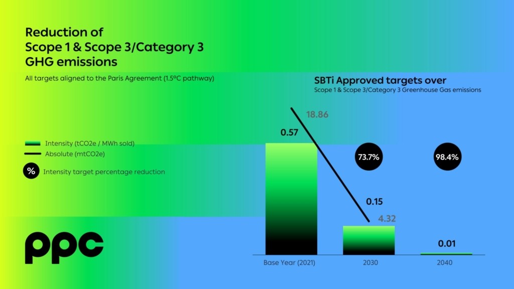 -μείωση 73,7% ανά πωληθείσα MWh των Scope 1 και Scope 3/κατηγορία 3 εκπομπών αερίων θερμοκηπίου, που σχετίζονται με δραστηριότητες από καύσιμα και ενέργεια και καλύπτουν το σύνολο της πωληθείσας ηλεκτρικής ενέργειας