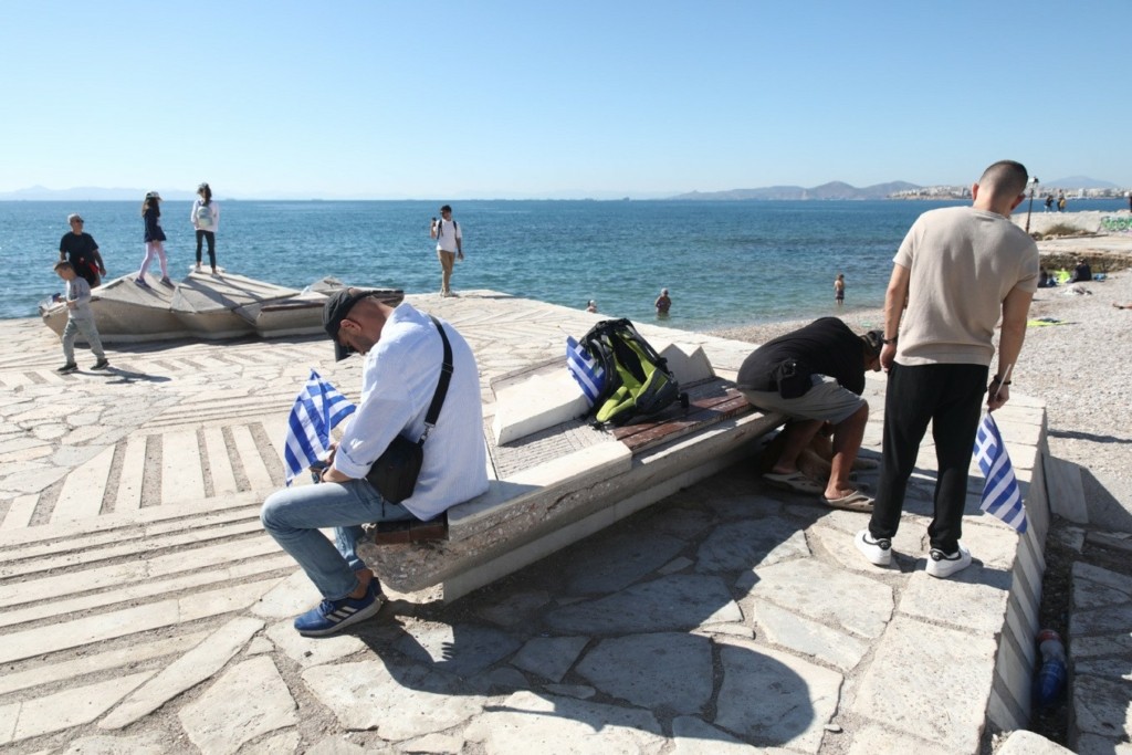 Κρατώντας τα απαραίτητα για την ημέρα σημαιάκια, πολλοί πολίτες στον Φλοίσβο έκαναν βόλτα στην παραλία, ηλιοθεραπεία, μέχρι και ποδήλατο.