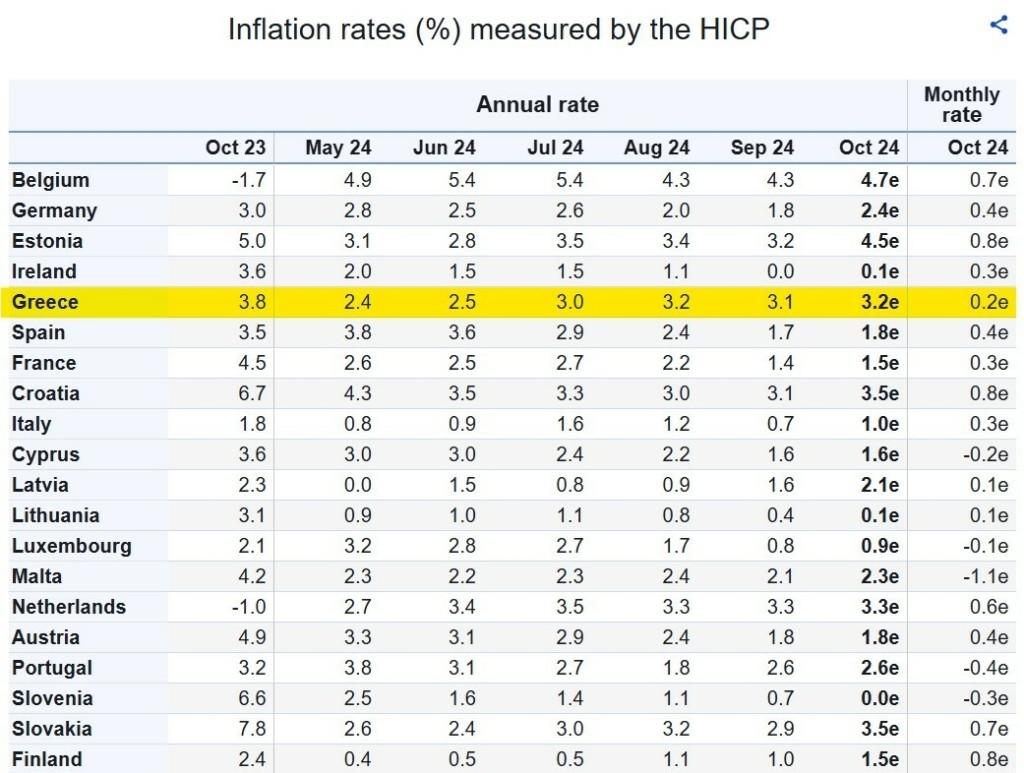 Συνεχίζονται οι αυξητικές τάσεις στον πληθωρισμό στην Ελλάδα, σύμφωνα με στοιχεία της Eurostat που δείχνουν ότι τον Οκτώβριο ο Δείκτης Τιμών Καταναλωτή στη χώρα μας διαμορφώθηκε στο 3,2% σε ετήσια βάση, από 3,1% τον περασμένο Σεπτέμβριο.