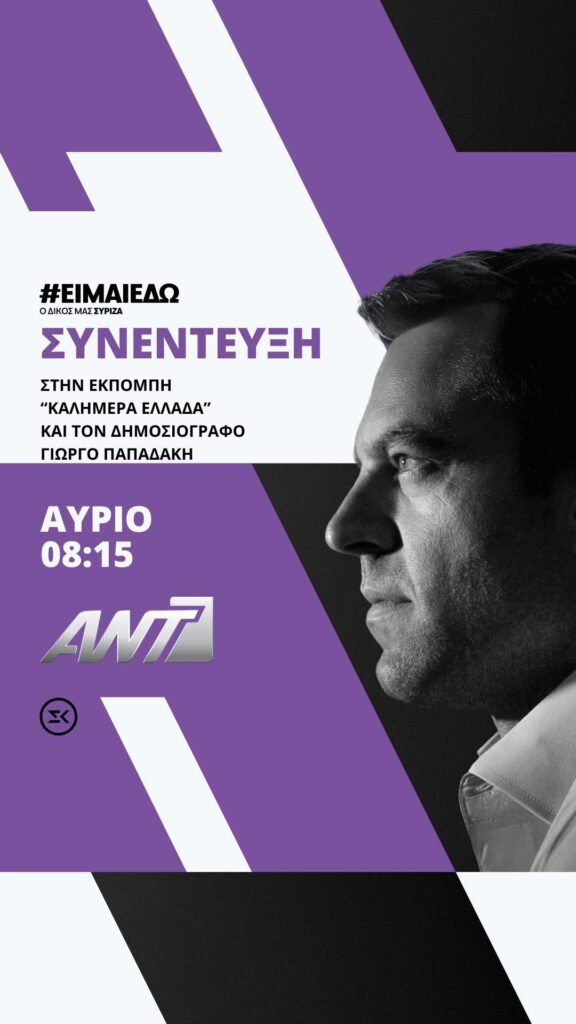 Συνέντευξη θα παραχωρήσει το πρωί της Παρασκευής (01/11) ο Στέφανος Κασσελάκης στην εκπομπή του Αντ1 «Καλημέρα Ελλάδα» και τον Γιώργο Παπαδάκη.