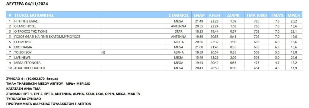 Έπειτα από την ανάπαυλα του Σαββατοκύριακου η «Γη της ελιάς» επέστρεψε εκεί όπου βρίσκεται συνήθως στις προτιμήσεις των τηλεθεατών. Σε απόσταση ανάσας τερμάτισε το «Grand Hotel» το οποίο την περασμένη εβδομάδα είχε κάνει ένα σερί στην κορυφαία θέση τηλεθέασης (29,30,31/10), σύμφωνα με τη Nielsen.