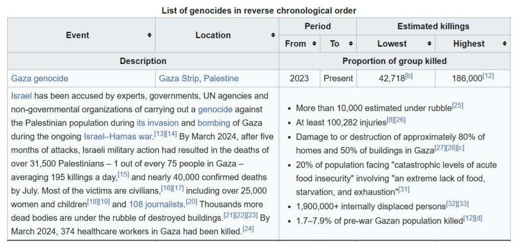 Στο σχετικό λήμμα, η Wikipedia αναφέρει ότι «το Ισραήλ έχει κατηγορηθεί από εμπειρογνώμονες, κυβερνήσεις, οργανισμούς του ΟΗΕ και μη κυβερνητικές οργανώσεις ότι πραγματοποίησε γενοκτονία κατά του παλαιστινιακού πληθυσμού κατά την εισβολή και τους βομβαρδισμούς του στη Γάζα κατά τη διάρκεια του συνεχιζόμενου πολέμου Ισραήλ-Χαμάς. Μέχρι τον Μάρτιο του 2024, μετά από πέντε μήνες επιθέσεων, η ισραηλινή στρατιωτική δράση είχε οδηγήσει στο θάνατο πάνω από 31.500 Παλαιστινίων – 1 στους 75 κατοίκους της Γάζας – κατά μέσο όρο 195 θανάτους την ημέρα και σχεδόν 40.000 επιβεβαιωμένους θανάτους μέχρι τον Ιούλιο. Τα περισσότερα από τα θύματα είναι άμαχοι, μεταξύ των οποίων πάνω από 25.000 γυναίκες και παιδιά, και 108 δημοσιογράφοι. Χιλιάδες ακόμη πτώματα βρίσκονται κάτω από τα ερείπια των κατεστραμμένων κτιρίων. Μέχρι τον Μάρτιο του 2024 είχαν σκοτωθεί 374 εργαζόμενοι στον τομέα της υγειονομικής περίθαλψης στη Γάζα».