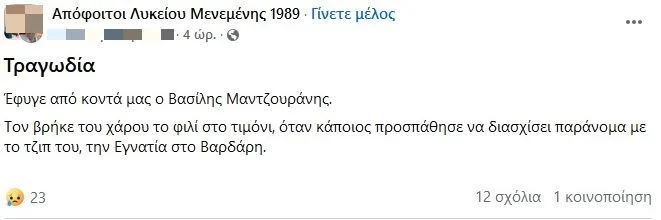 Πληροφορίες του thestival.gr αναφέρουν πως ο 53χρονος μετέβη του βράδυ του Σαββάτου στο κέντρο προκειμένου να πάρει τα δύο 16χρονα παιδιά του και τους τρεις ανήλικους προκειμένου να τους επιστρέψει στα σπίτια τους. Κατά την επιστροφή τους προς περιοχή της δυτικής Θεσσαλονίκης, έγινε η μοιραία σύγκρουση που του κόστισε τη ζωή.