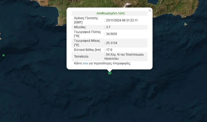 Σύμφωνα με το Γεωδυναμικό Ινστιτούτο το επίκεντρο του σεισμού βρίσκεται στα 54 χιλιόμετρα νότια του Τσούτσουρου Ηρακλείου.