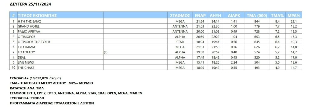 Η σειρά κατάταξης στην ιεράρχηση των τηλεπροτιμήσεων από την πρώτη έως την έβδομη θέση είναι ίδια ακριβώς με εκείνη της ίδιας ημέρας, της περασμένης εβδομάδας, σύμφωνα με τα στοιχεία της Nielsen. Εκείνα που είχαν διαφοροποιήσεις, όχι έντονες, ήταν τα ποσοστά τηλεθέασης των εκπομπών.