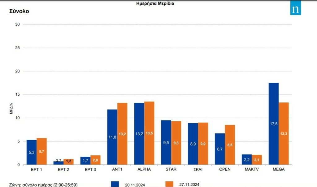 Καιρό είχε να παρατηρηθεί το φαινόμενο τρία κανάλια να έχουν το ίδιο διψήφιο νούμερο στο κύριο μέρος των μεριδίων τους. Αυτό συνέβη χθες μεταξύ Alpha, ANT1 και Mega. Οι μεταξύ τους διαφορές ήταν πολύ μικρές.