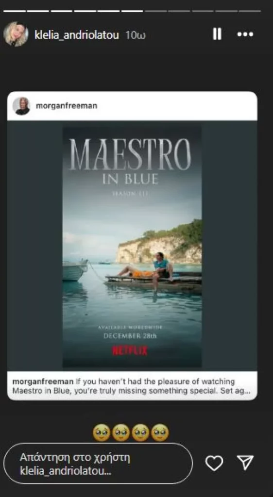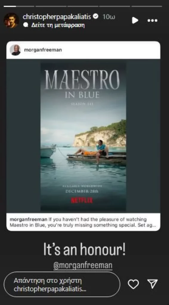 «Αν δεν είχατε την ευχαρίστηση να παρακολουθήσετε το Maestro in Blue, χάνετε πραγματικά κάτι ξεχωριστό. Με φόντο τους Παξούς που κόβουν την ανάσα -ένα μικρό ελληνικό νησί που είναι κοντά στην καρδιά μου- αυτή η σειρά είναι ένα αριστούργημα. Σημειώστε τα ημερολόγιά σας, φίλοι μου. Η τρίτη και τελευταία σεζόν φτάνει στο Netflix, στις 28 Δεκεμβρίου. Μην το χάσετε» έγραψε συγκεκριμένα ο Μόργκαν Φρίμαν.