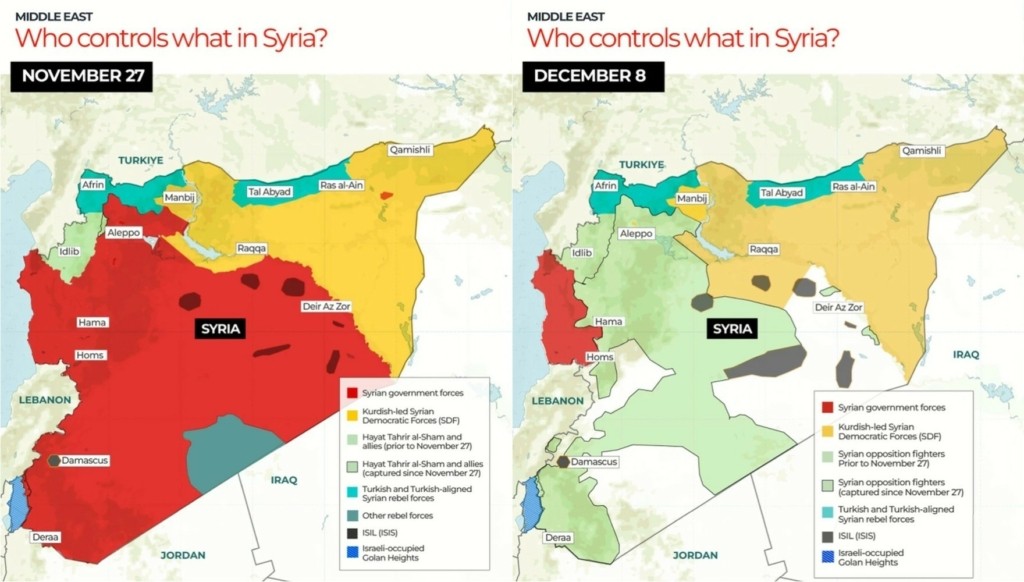 Επρόκειτο για δυο καίριας σημασίας συμμάχους του πλέον έκπτωτου σύρου προέδρου. Η αστραπιαία προέλαση των ριζοσπαστών ισλαμιστών της Χαγιάτ Ταχρίρ ας Σαμ (ΧΤΣ, ο πρώην συριακός βραχίονας της Αλ Κάιντα, που διαβεβαιώνει πως διέκοψε κάθε σχέση μαζί της) κι οργανώσεων ανταρτών προσκείμενων στην Τουρκία κατέλαβε τον κόσμο όλο εξαπίνης.