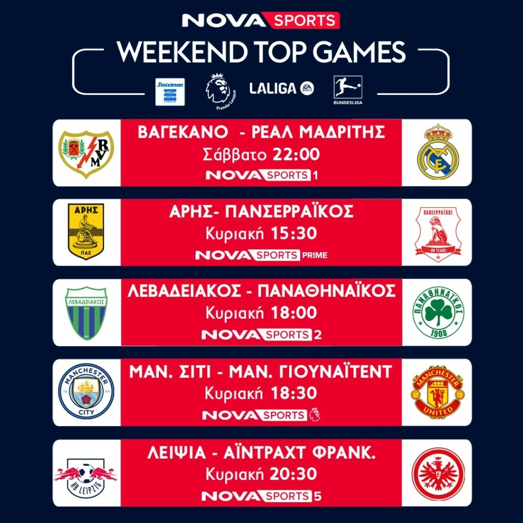 Η συναρπαστική LaLiga στην Ισπανία συνεχίζεται στα κανάλια Novasports με τους αγώνες Βαγεκάνο-Ρεάλ Μαδρίτης (14/12, 22:00, Μπαρτσελόνα – Λεγανές (15/12, 22:00) και Ατλέτικο Μαδρίτης – Χετάφε (15/12, 15:00). Την ίδια στιγμή η θεαματική Bundesliga στη Γερμανία περιλαμβάνει στο πρόγραμμα τις αναμετρήσεις Μάιντς-Μπάγερν (14/12, 16:30), Άουγκσμπουργκ-Μπάγερ Λεβερκούζεν (14/12, 16:30), Ντόρτμουντ-Χοφενχάιμ (15/12, 18:30) και Λειψία – Άιντραχτ Φρανκφούρτης (15/12, 20:30) που θα μεταδοθούν στα κανάλια Novasports. Η εκπομπή «Matchday Live» με τον Ηλία Βλάχο μεταφέρει λεπτό προς λεπτό όλη την αθλητική δραστηριότητα από τη Bundesliga αλλά και από τα άλλα πρωταθλήματα που είναι εκείνη την ώρα σε εξέλιξη.