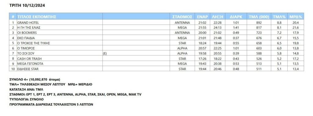 Πρώτο σε τηλεθέαση το Mega και την Τρίτη (10/12) παρά την πτωτική τάση στην επίδοση του