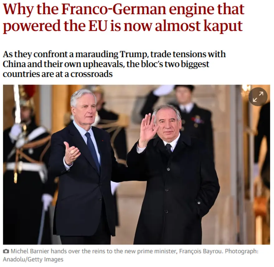 Τέλμα βλέπει ο Guardian στον γαλλογερμανικό άξονα και την βιομηχανική και οικονομική καρδιά της ΕΕ να καταρρέει, σε σημερινή ανάλυση της εφημερίδας.