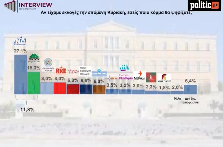 Σύμφωνα με τη δημοσκόπηση, η Νέα Δημοκρατία παραμένει στην κορυφή με ποσοστό 27,1%. Το ΠΑΣΟΚ – Κίνημα Αλλαγής εδραιώνεται στη δεύτερη θέση (15,3%), ενώ το ΚΚΕ και η Ελληνική Λύση εμφανίζονται να ισοψηφούν στην τρίτη θέση με 8%.