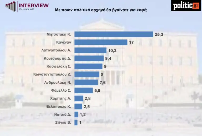 Ιδιαίτερο ενδιαφέρον παρουσιάζει και η καρτέλα με την ερώτηση: «Με ποιον πολιτικό αρχηγό θα βγαίνατε για καφέ;». Πρώτος σε προτίμηση έρχεται ο πρωθυπουργός και στη δεύτερη θέση είναι ο «κανένας». Στη τρίτη θέση είναι η Α. Λατινοπούλου, στην τέταρτη ο Δ. Κουτσούμπας και στην πέμπτη ο Στ. Κασσελάκης.