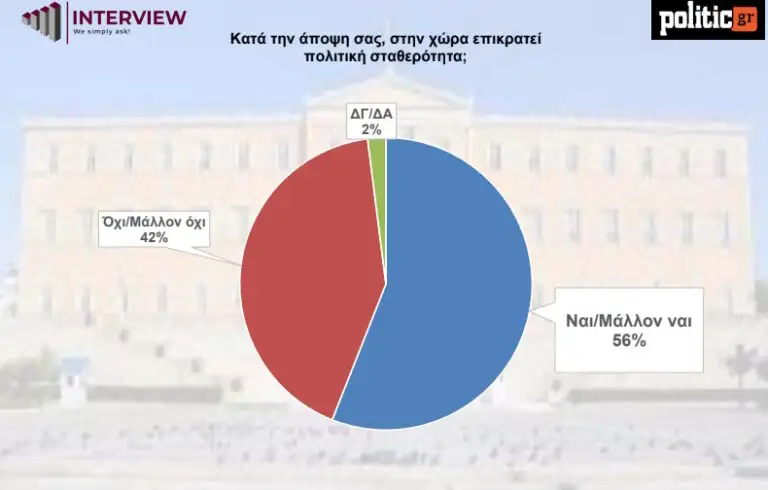 Η αναγωγή της πολιτικής σταθερότητας σε εθνική αναγκαιότητα ήταν από τα βασικά προεκλογικά μηνύματα της ΝΔ, και το γεγονός ότι η πλειοψηφία των ερωτηθέντων (56%) θεωρεί ότι στη χώρα επικρατεί πολιτική σταθερότητα δείχνει ότι το κυβερνών κόμμα κέρδισε το συγκεκριμένο στοίχημα.