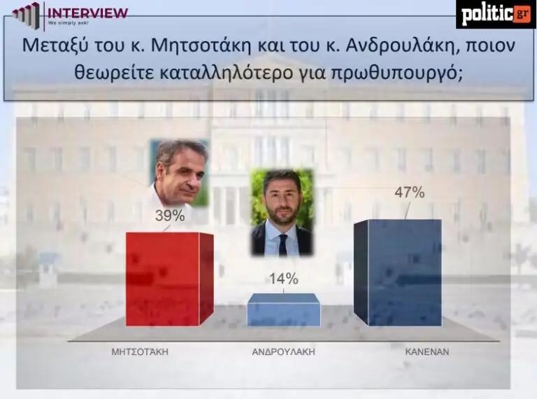 Στην καταλληλότητα πρωθυπουργού ο «Κανένας» (47%) είναι πρώτος σε σχέση με τους προέδρους των δύο πρώτων κομμάτων. Ο Μητσοτάκης είναι στο 39% και ο Ανδρουλάκης αρκετά χαμηλότερα στο 14%.