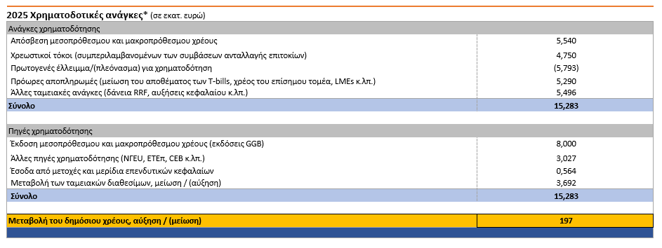 Η στρατηγική αυτή η οποία στηρίζεται κατά κύριο λόγο στα μεγέθη του Προϋπολογισμού που ψηφίστηκε προσφάτως από τη Βουλή, προβλέπει ότι οι χρηματοδοτικές ανάγκες του Ελληνικού Δημοσίου για το 2025 οι οποίες ανέρχονται σε 15,823 δισ. ευρώ θα καλυφθούν κατά το ήμισυ περίπου -53% (8 δισ. ευρώ)- με προσφυγή και δανεισμό από τις αγορές, ενώ τα υπόλοιπα 3 δισ. ευρώ θα καλυφθούν με δανεισμό από υπερεθνικούς οργανισμούς (ΕΙΒ, EBRD, Tαμείο Ανάκαμψης). Τα περίπου 3,7 δισ. ευρώ θα καλυφθούν από τα ταμειακά διαθέσιμα του Δημοσίου τα οποία στο τέλος του 2024 θα ανέρχονται σε 33 δισ. ευρώ.