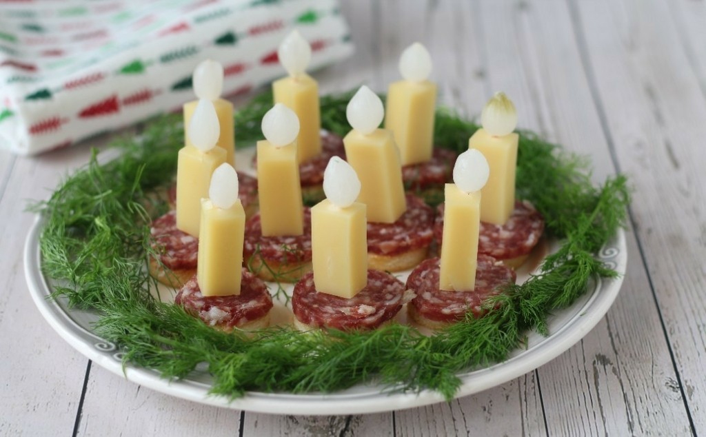 4.Καρφώστε το μπαστουνάκι στη βάση του σαλαμιού για να μιμηθείτε τη βάση του κηροπηγίου και στην πάνω μεριά της κατασκευής τοποθετήστε ένα λευκό κρεμμυδάκι τουρσί ή μια μπαλίτσα μοτσαρέλας για να αναπαραστήσετε τη φλόγα του κεριού.