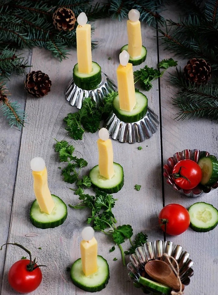 5.Στολίστε τα φαγώσιμα κεριά σε μια πιατέλα και διακοσμήστε με πρασινάδες και ωμά λαχανικά.