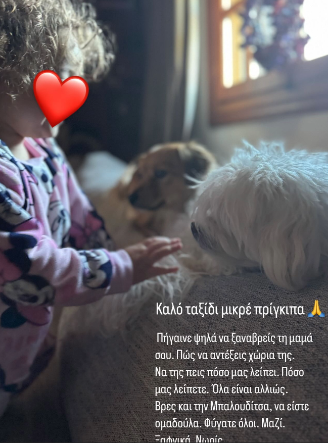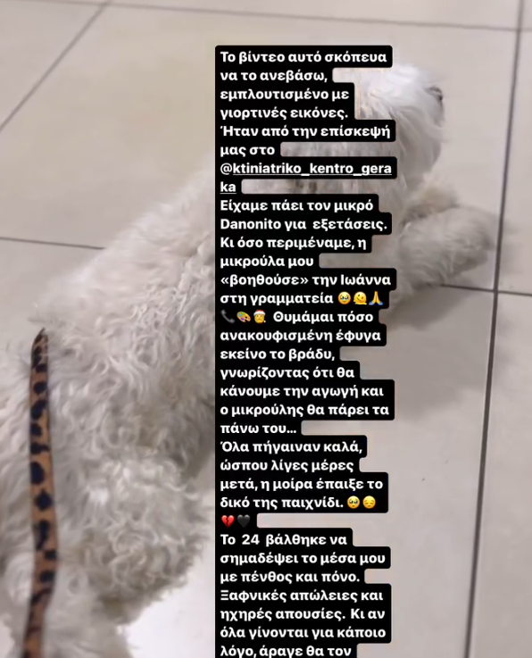 «Το βίντεο αυτό σκόπευα να το ανεβάσω εμπλουτισμένο με γιορτινές εικόνες. Ήταν από την επίσκεψη μας στο κτηνιατρείο όπου είχαμε πάει τον μικρό Danorito για εξετάσεις. Κι όσο περιμέναμε, η μικρούλα μου “βοηθούσε” την Ιωάννα στη γραμματεία. Θυμάμαι πόσο ανακουφισμένη έφυγα εκείνο το βράδυ, γνωρίζοντας ότι θα κάνουμε την αγωγή και ο μικρούλης θα πάρει τα πάνω του. Όλα πήγαιναν καλά ώσπου, λίγες μέρες μετά, η μοίρα έπαιξε το δικό της παιχνίδι. Το 2024 βάλθηκε να σημαδέψει το μέσα μου με πένθος και πόνο. Ξαφνικές απώλειες και ηχηρές απώλειες. Κι αν όλα γίνονται για κάποιο λόγο, άραγε θα τον μάθουμε ποτέ; Καλό ταξίδι μικρέ πρίγκιπα. Πήγαινε ψηλά να ξαναβρείς τη μαμά σου. Πως να αντέξεις χώρια της. Να της πεις πόσο μας λείπει. Πόσο μας λείπετε. Όλα είναι αλλιώς. Βρες και την Μπαλουδίτσα, να είστε ομαδούλα. Φύγατε όλοι. Μαζί. Ξαφνικά. Νωρίς» έγραψε, αναφερόμενη και στο σκυλάκι που είχε χρόνια κι επίσης έχασε αυτή τη χρονιά.