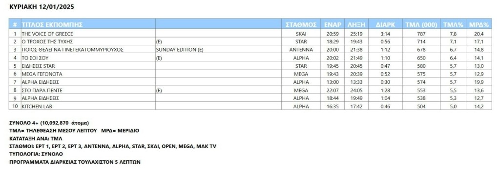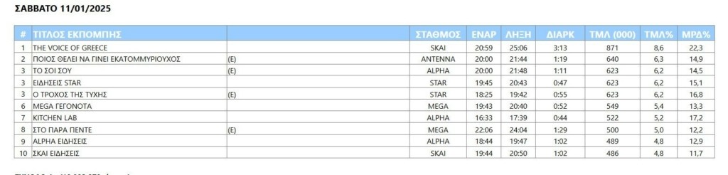 Το μουσικό σόου «The voice of Greece» λειτούργησε σαν μαγνήτης τηλεθεατών στον ΣΚΑΪ και ήταν το πρόγραμμα με την υψηλότερη τηλεθέασης και τις δύο ημέρες του Σαββατοκύριακου.