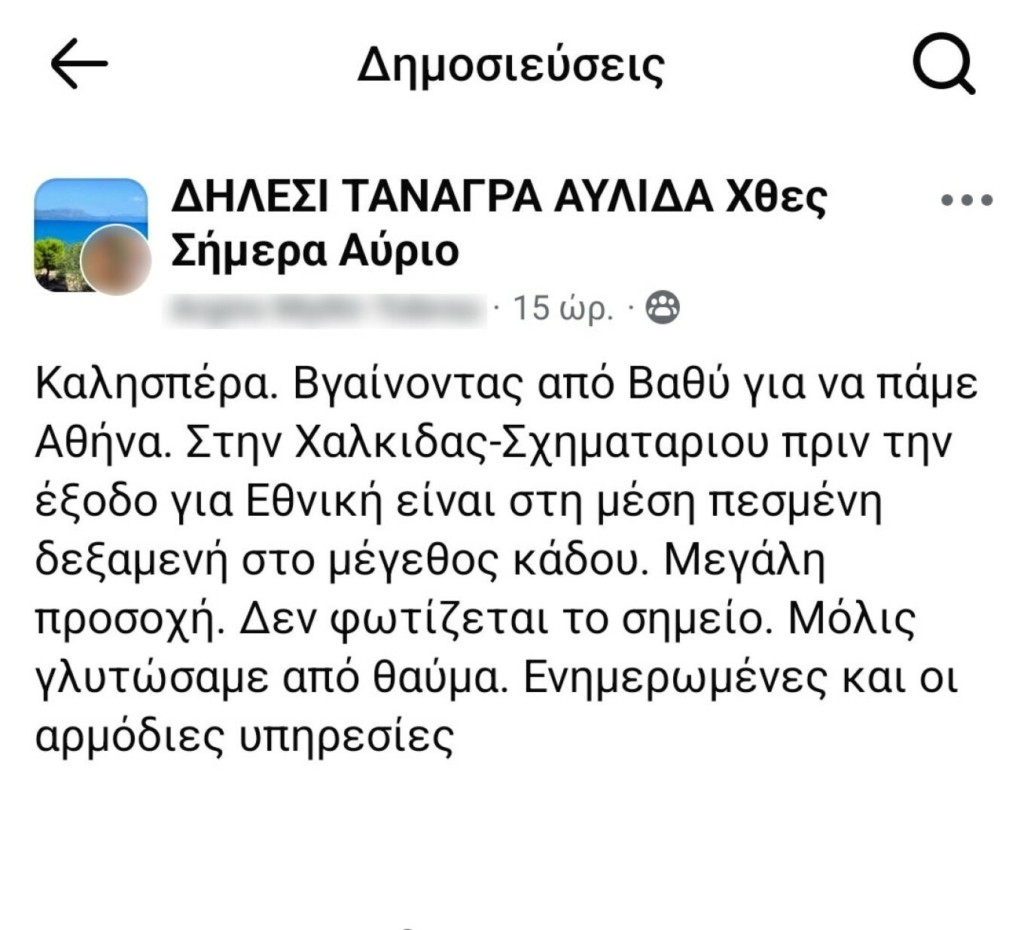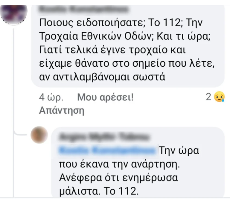 Συγκεκριμένα, όπως προκύπτει από ανάρτηση σε ομάδα του Facebook με ειδήσεις από το Δήλεσι, την Τανάγρα και την Αυλίδα, η γυναίκα που είχε περάσει από το μοιραίο σημείο λίγο πριν από το τροχαίο, αναφέρει: