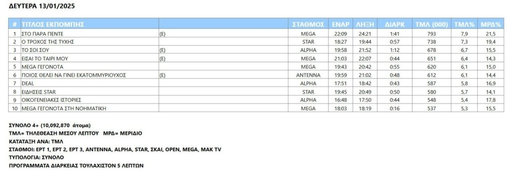 Μια ακόμα-αειθαλής- σειρά του Mega σε επανάληψη, η κωμωδία «Είσαι το ταίρι μου», πέρασε στην κορυφαία πεντάδα η οποία συμπληρώθηκε από το κεντρικό δελτίο ειδήσεων του σταθμού.