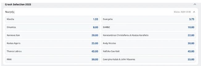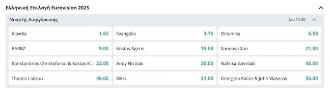 Αναλυτικά, στη Stoiximan η Klavdia έχει απόδοση 1.55 για τη νίκη στον εθνικό τελικό για τη Eurovision 2025 και την ακολουθούν η Evangelia με 3.75 και οι Dinamiss. Οι υπόλοιπες 12 συμμετοχές του εθνικού τελικού για τη Eurovision 2025 έχουν διψήφιες αποδόσεις, που φτάνουν μέχρι και το 55.