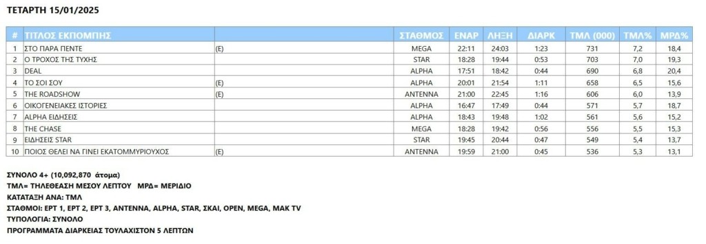 Από τα… τζαρττζαρίσματα τηλεθέασης που έγιναν, το επαναληπτικό «The Roadshow» υποχώρησε κατά μία θέση στο ημερήσιο τηλεβαρόμετρο, ενώ επανεμφανίστηκαν στην ξεχωριστή 10αδα οι «Οικογενειακές υποθέσεις», αλλά και το τηλεπαιχνίδι «The chase»