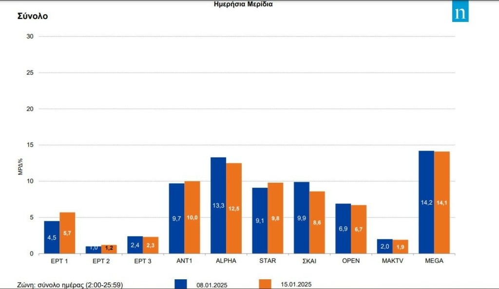 Αν και με αμελητέα διαφοροποίηση, ήταν μασίφ και την Τετάρτη (15/1) το πλήθος τηλεθεατών στο Mega, το οποίο διατηρήθηκε πρώτο στις προτιμήσεις. Από τον ανταγωνισμό παρουσιάστηκαν με βελτιωμένες επιδόσεις ο Alpha– δεύτερος στις επιλογές του τηλεοπτικού κοινού στη διάρκεια της ημέρας- και το Open.