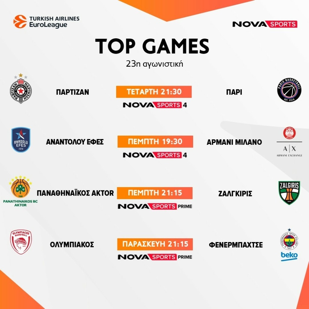 Η EuroLeague η κορυφαία ευρωπαϊκή διασυλλογική διοργάνωση στο χώρο του μπάσκετ συνεχίζεται με αμείωτο ενδιαφέρον και οι συνδρομητές της Nova ετοιμάζονται για τις αναμετρήσεις της 23ης αγωνιστικής Παναθηναϊκός AKTOR – Ζαλγκίρις (23/1, 21:15) και Ολυμπιακός – Φενέρμπαχτσε (24/1, 21:15) στο παρκέ του Novasports!