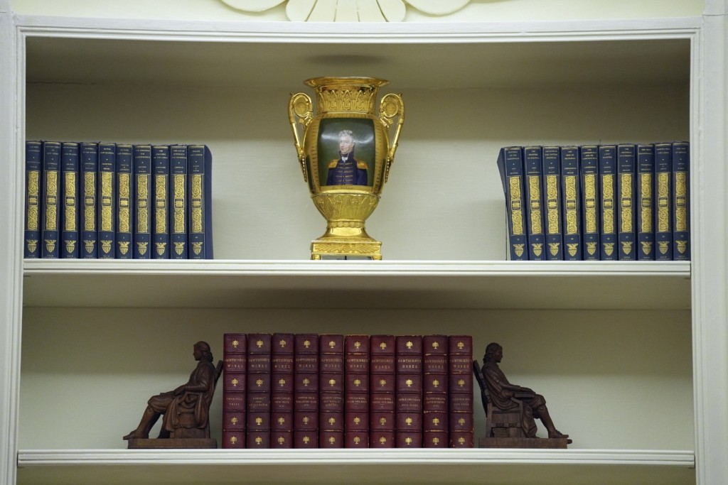 «Τζορτζ Ουάσινγκτον, μου αρέσει (…) Τόμας Τζέφερσον, μου αρέσει». Έχοντας επιστρέψει στο Οβάλ Γραφείο, του οποίου μόλις άλλαξε τη διακόσμηση, ο Ντόναλντ Τραμπ ελέγχει τα πορτρέτα των προκατόχων του που κοσμούν τους τοίχους.