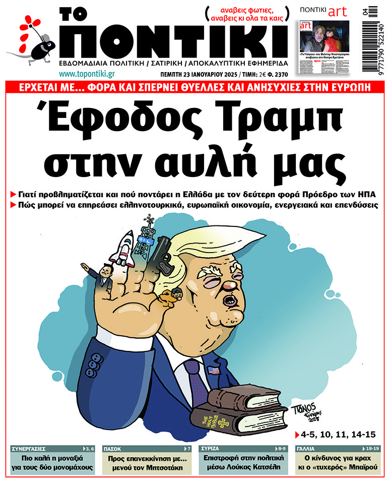 Με πρωτοσέλιδο τίτλο «Έφοδος Τραμπ στην αυλή μας» και αναλυτικό – αποκαλυπτικό ρεπορτάζ για τους λόγους που προβληματίζεται και πού ποντάρει η Ελλάδα με τον δεύτερη φορά Πρόεδρο των ΗΠΑ, αλλά και για το πώς μπορεί να επηρεάσει ελληνοτουρκικά, ευρωπαϊκή οικονομία, ενεργειακά και επενδύσεις, κυκλοφορεί το «ΠΟΝΤΙΚΙ» το πρωί της Πέμπτης.