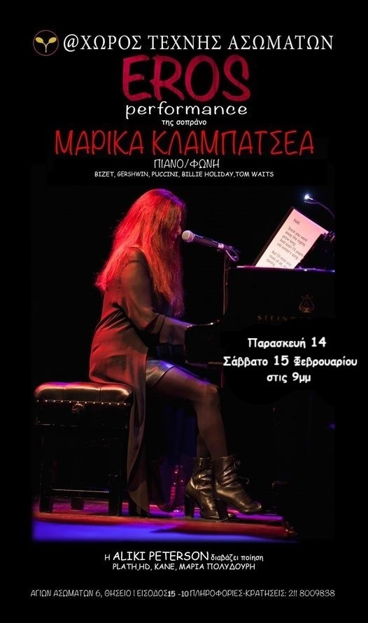 Στον έρωτα που μουσικοί και ποιητές επένδυσαν χιλιάδες λέξεις κι εκατομμύρια νότες. Σ’ αυτόν είναι αφιερωμένη η performance “EROS” που παρουσιάζει για τη Γιορτή του Αγίου Βαλεντίνου η βραβευμένη σοπράνο, συνθέτρια και πιανίστα Μαρίκα Κλαμπατσέα.