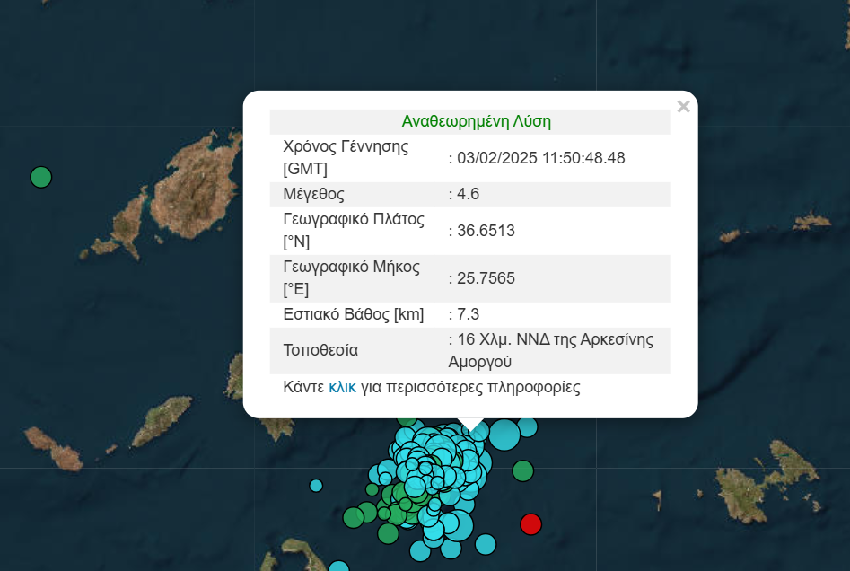 Το επίκεντρο της δόνησης εντοπίζεται στον θαλάσσιο χώρο 20 χλμ. νότια της Αρκεσίνης Αμοργού, σύμφωνα με το Γεωδυναμικό Ινστιτούτο του Εθνικού Αστεροσκοπείου Αθηνών.