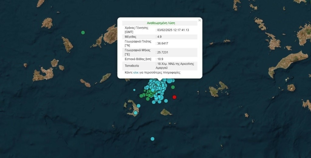 Σύμφωνα, με το Γεωδυναμικό Ινστιτούτο, στις 2:17 το μεσημέρι καταγράφηκε σεισμός μεγέθους 4,9 βαθμών της κλίμακας Ρίχτερ με επίκεντρο 18 χιλιόμετρα νότια-νοτιοδυτικά της Αρκεσίνης Αμοργού και εστιακό βάθος τα 10,9 χιλιόμετρα.