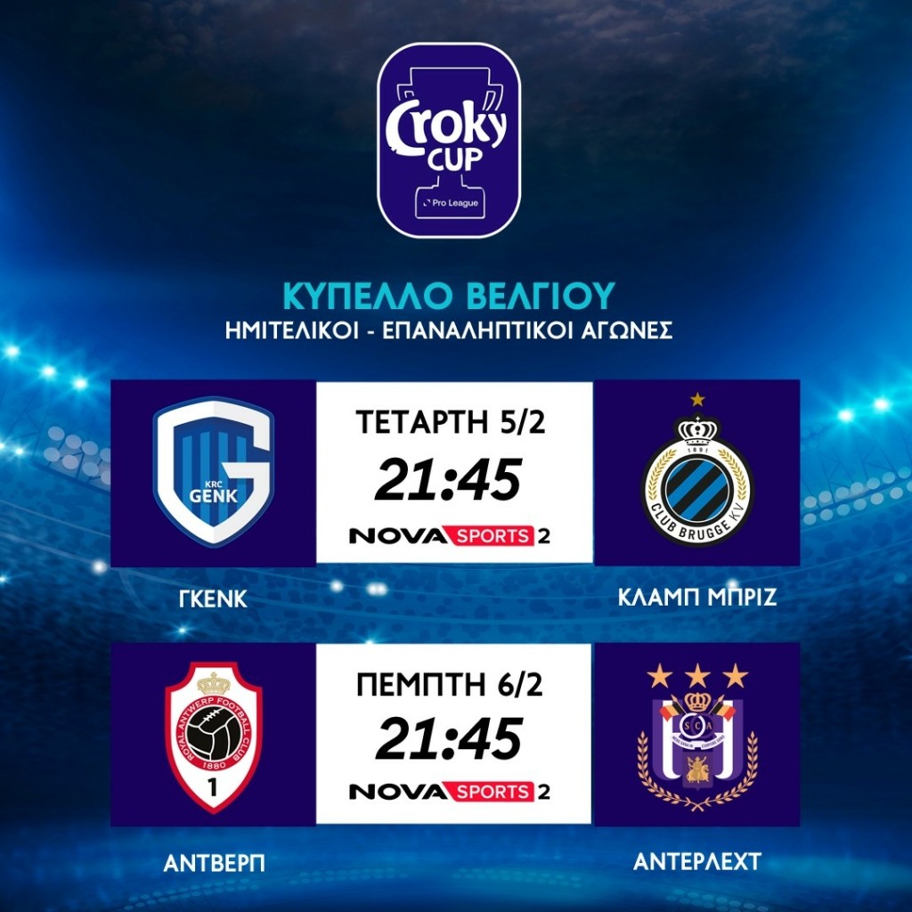 21:45 Croky Cup – A’ Ημιτελικός Επαναληπτικός αγώνας: Γκενκ-Κλαμπ Μπριζ Novasports2 σε περιγραφή του Αποστόλη Λάμπου